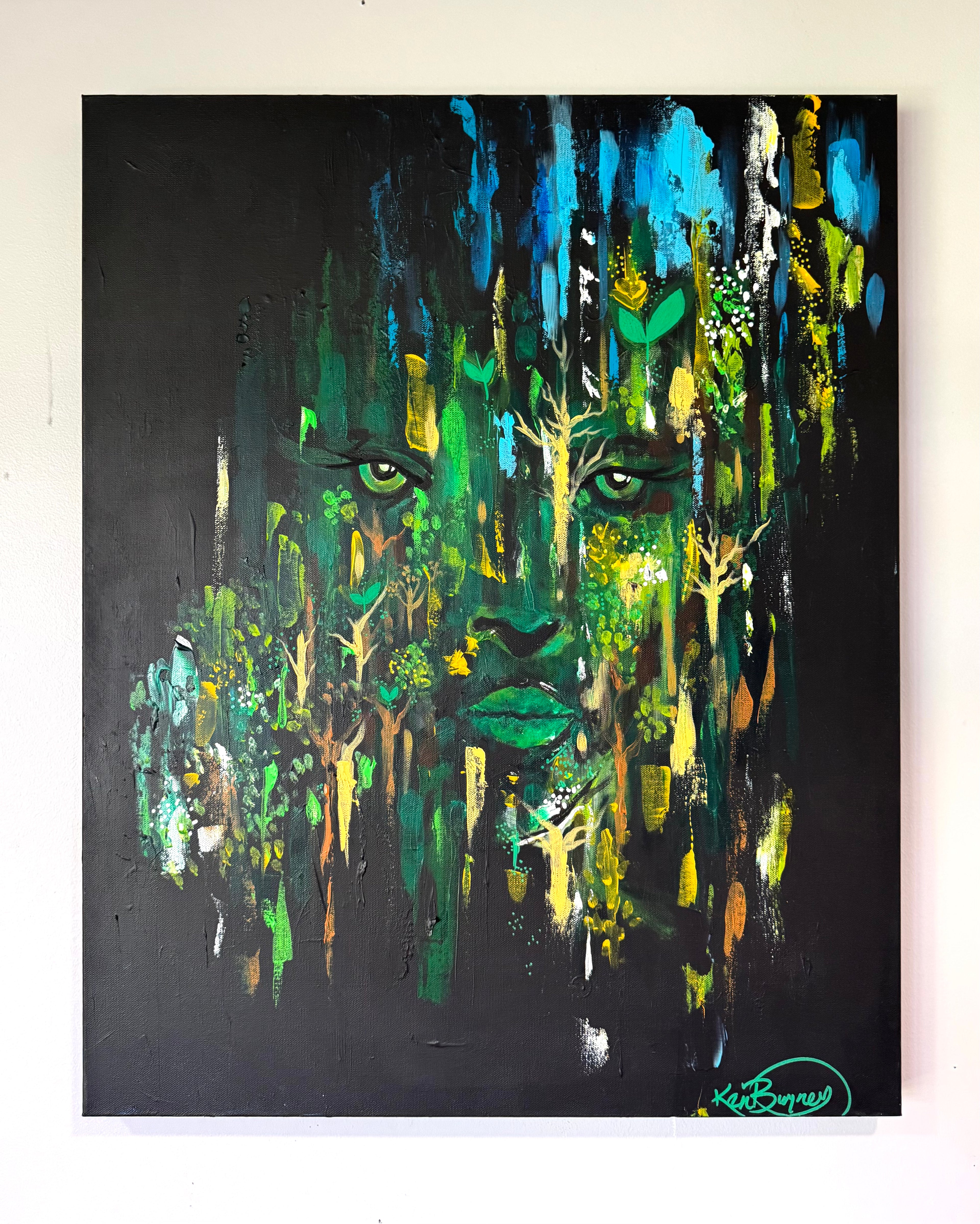 “Earth,” from Ken Burney’s Element Series, reveals a human face interwoven with trees and vibrant color, symbolizing the powerful bond between humanity and nature.